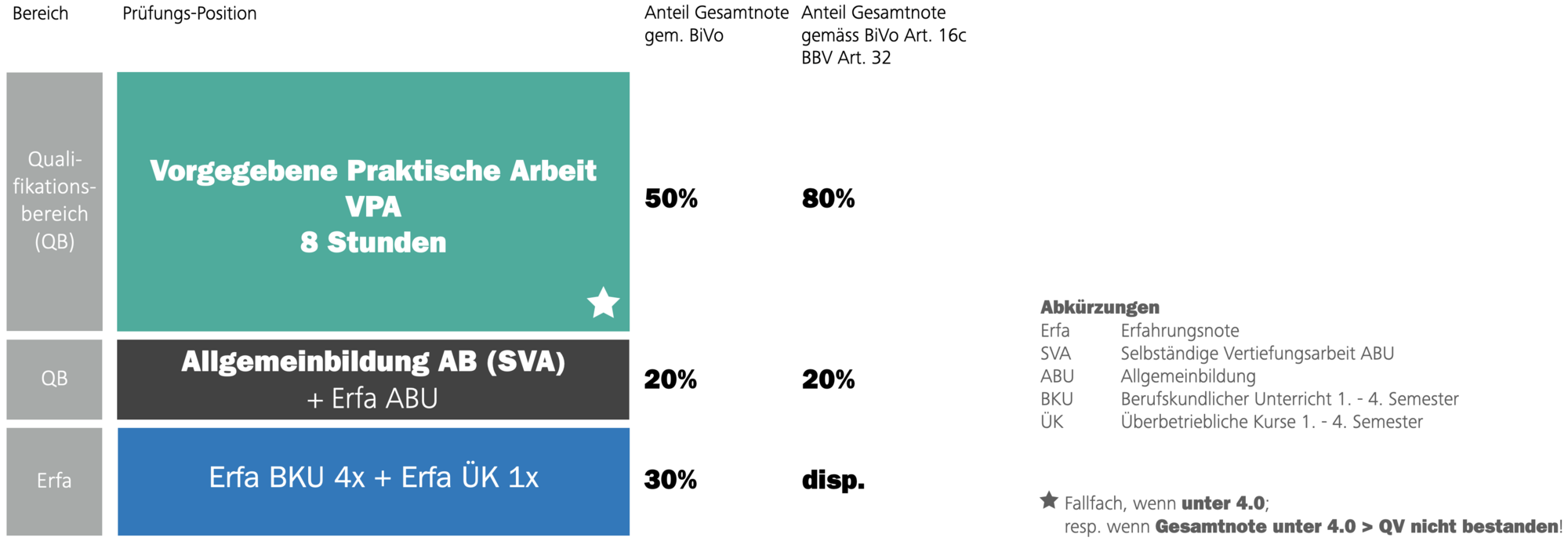 Sie müssen in allen Positionen, die mit einem Sternchen (VPA) gekennzeichnet sind, mindestens eine Note 4.0 erreichen, damit Sie das QV bestehen, resp. eine Gesamtnote von 4.0 oder höher haben.