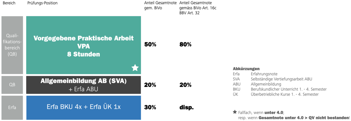 Die VPA ist ein Fallfach, wenn diese Note unter 4.0; resp. wenn die Gesamtnote unter 4.0 ist QV EBA nicht bestanden! Im Wiederholungsfalle müssen alle Qualifikationsbereiche welche unter 4.0 waren wiederholt werden.